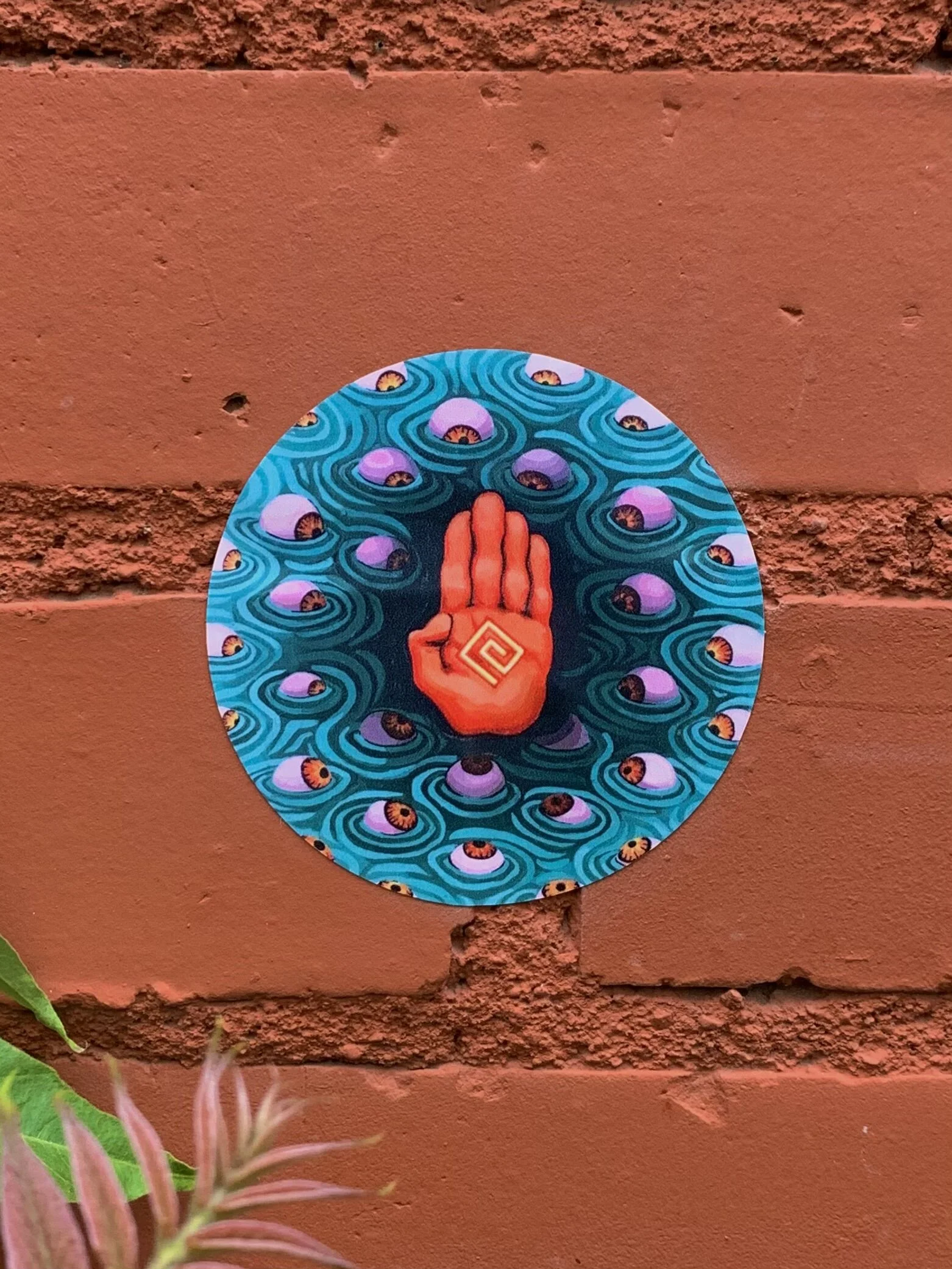 Sticker bomb water bottles, skateboards, street signs, and more with our Contingency sticker. Inspired by the Buddhist doctrine of interdependent arising, this design reflects the idea that everything is connected, and we rely on our environment and circumstances to exist. Each sticker is roughly 3” in diameter.